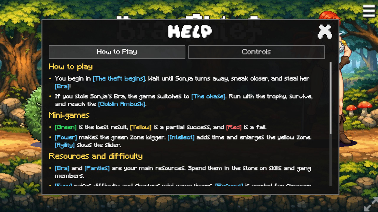 Bra Thief is a small, disgusting, but proud goblin who has decided to risk his life by stealing the bra of a mighty heroine for eternal glory. The only way for a young goblin to prove himself is to steal the bra and panties — earning Respect in the eyes of the entire tribe.